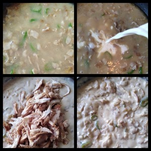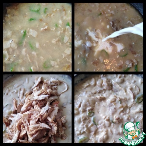 Добавить бульон помешивая, затем сливки. Соус должен загустеть. Курицу разобрать на кусочки руками или двумя вилками, добавить в соус и перемешать, снять с огня.