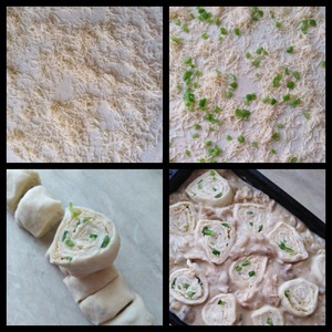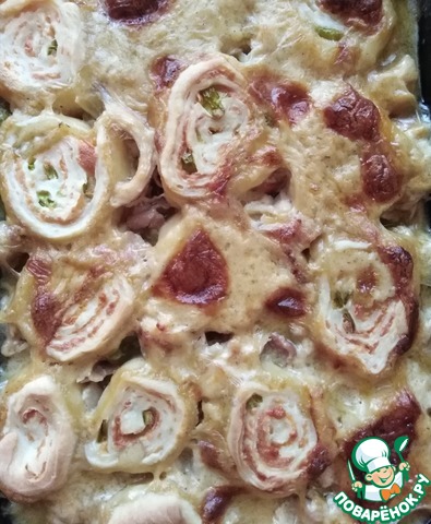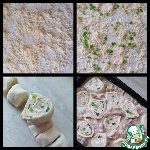 Тесто раскатать 2-3мм толщиной, посыпать тёртым сыром и порезаным перцем 3 шт. Свернуть плотно в рулет, нарезать на части. В форму для запекания перелить соус и сверху положить кусочки рулета, немного вдавливая их внутрь.