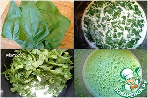 Листья шпината порезать, положить в кастрюлю, добавит молоко. Варить одну минуту с момента закипания. Немного остудить, измельчить в блендере.