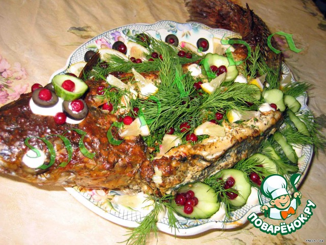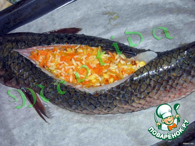 Издавна рыба считается традиционной русской едой. Вкусно приготовленная и красиво поданная, она была непременным атрибутом царских застольев… Поэтому предлагаю и нам с Вам насладиться кусочком царь-рыбы, запеченной в духовке в одежде из сметанки, чесночка и ароматнейших специй.. С интересной.. сочной.. пикантной начинкой из риса, яблочка, морковочки, лучка, кукурузки и лолжечки коньячка для еще большего аромата Употребление рыбы 2 раза в неделю снижает риск сердечных заболеваний на треть, так что, давайте кушать вкусно и жить долго и счастливо :)