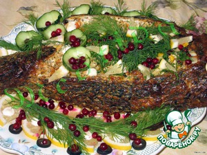 готовую рыбку перекладываем на блюдо, украшаем на свой вкус и