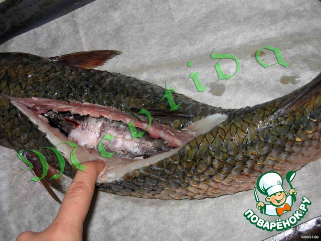 делаем надрез на спинке, вдоль позвоночника и виниваем внутренности (если Вам попадется икра, то ее тоже можно добавить в начинку) -