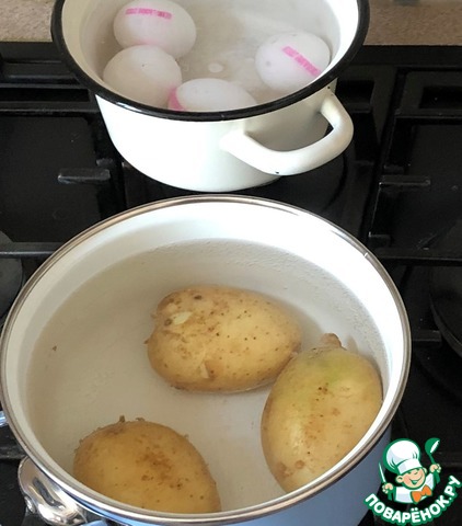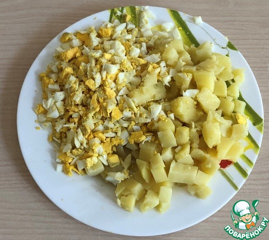 Холодную картошку и яйца чистим и режем размером 1х1см. (яйца мельче)