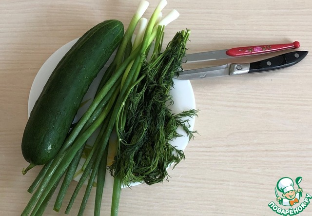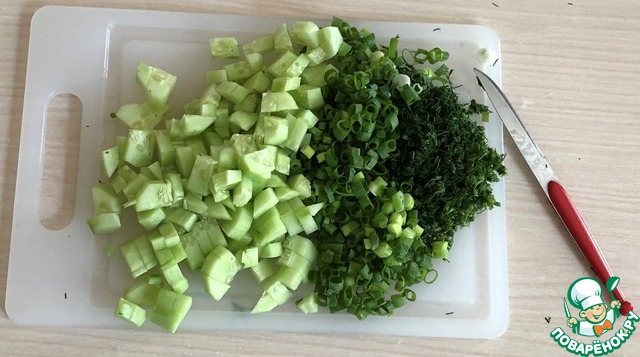 Огурец чистим и режем мелкими кубиками, укроп и зелёный лук мелко нарезать. У нас всё готово к завершающему этапу!