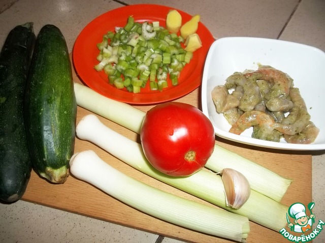 Мелко нарезать сельдерей, зелень, лук порей колечками, цуккини и помидор маленькими кубиками (кабачок очистить от кожицы). Чеснок потолочь или пропустить через пресс. Креветки приготовить по вашему вкусу. Я сначала мариную, затем быстро обжариваю или запекаю минут 5. Если берете курицу, то приготовьте ее заранее.