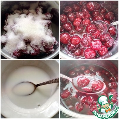 В воде развести крахмал и при постоянном помешивании ввести его в кипящую вишню. Проварить до загустения, снять с огня и остудить. -
