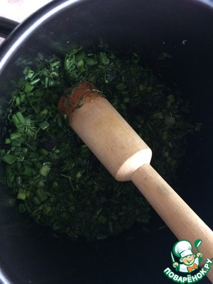 Укроп и зелёный лук мелко измельчить и растереть с солью толкушкой до того момента, пока не выделится сок