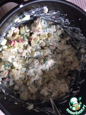 Куриную грудку, картофель и яйца отварить заранее и остудить, нарезать мелким кубиком, оставшиеся огурцы, редиску, также нарезать. Добавить сметану, перемешать.