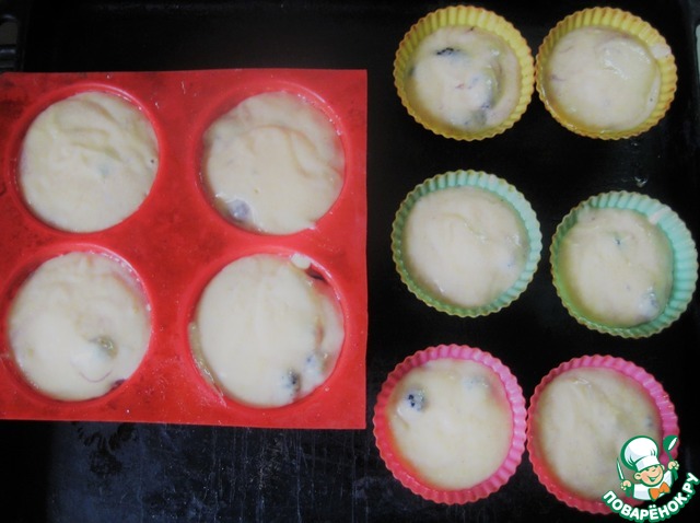 Заполнить формы для кексов (у меня получилось 10 шт.), отправить выпекаться в разогретую до 190 градусов духовку на 15-20 минут. Ориентируйтесь на особенности своей духовки, готовность проверяем деревянной шпажкой. Готовые кексы вынимаем из духовки и даем им остыть.