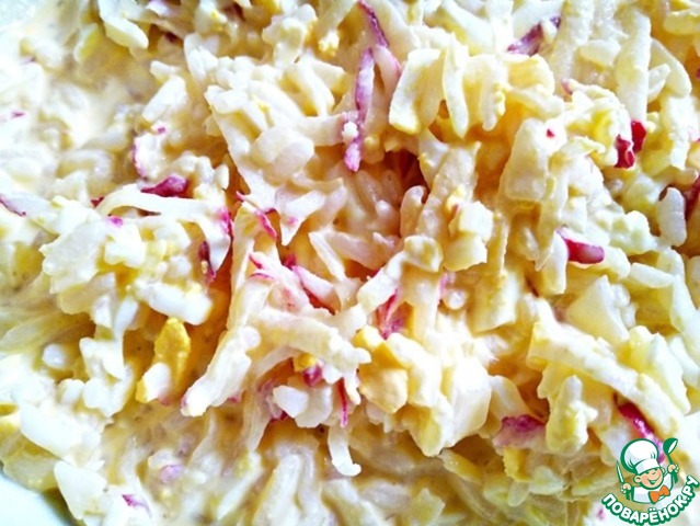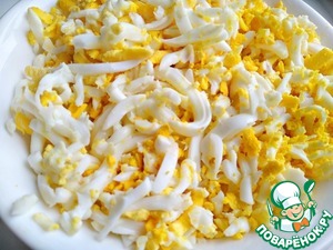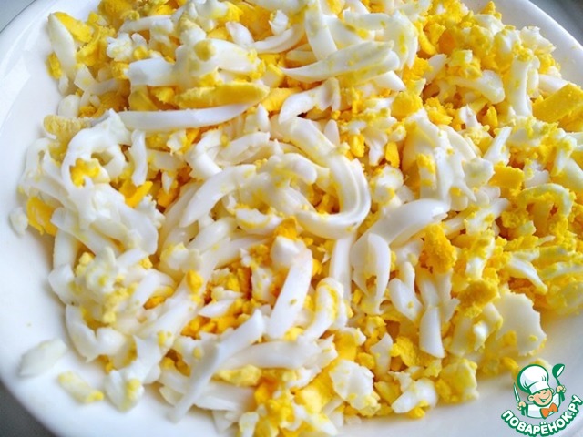 Яйца отварить вкрутую, почистить, натереть на крупной терке.