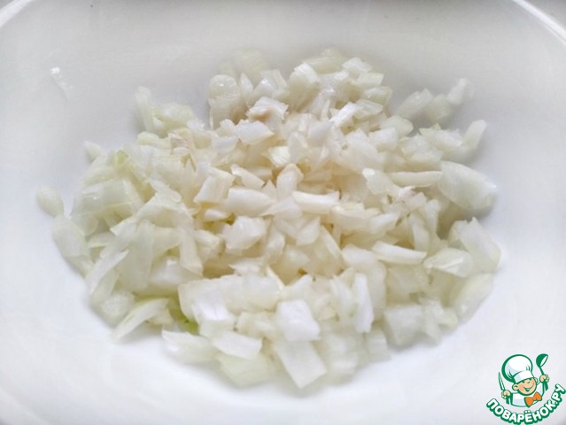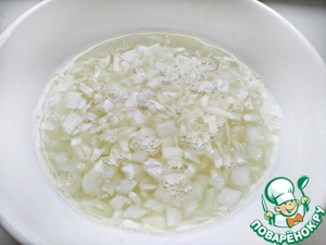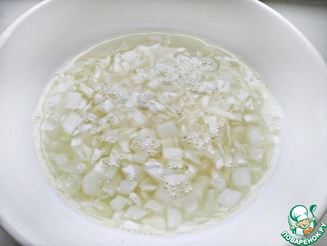 Обдать лук крутым кипятком, чтобы ушла горечь, затем промыть холодной проточной водой.