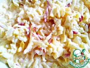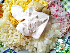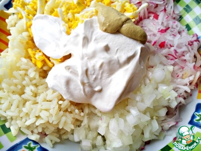 Сложить в салатник все подготовленные ингредиенты, добавить сметану, соль и горчицу.