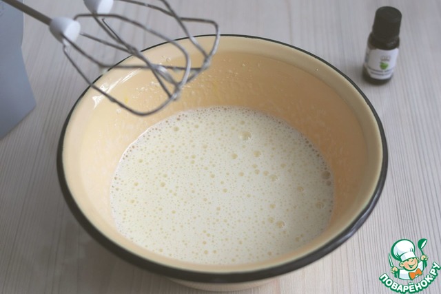 Взбить яйца при помощи миксера до пышности. Добавить сахар (100 гр.)., добавить 4 капли ароматизатора "Зеленое яблоко".