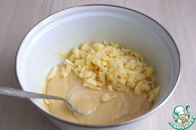 Яблоки почистить, удалить сердцевину, нарезать яблоки мелкими кубиками (кусочками). В жидкое тесто добавить нарезанные кусочками яблоки. Смесь хорошо вымешать.