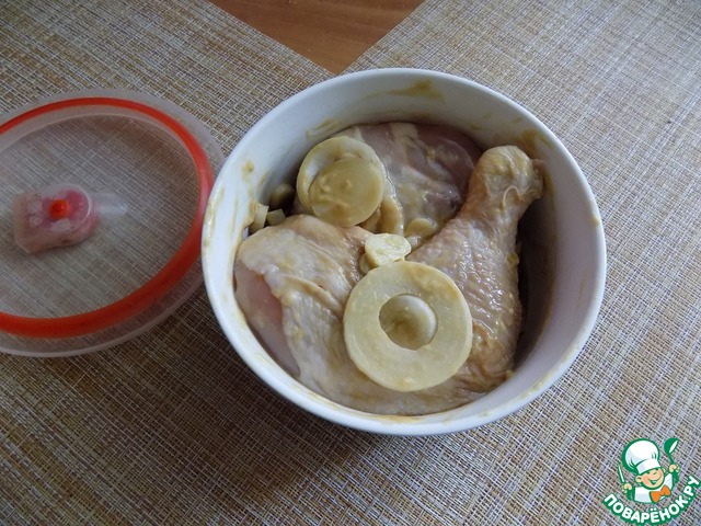 Я всегда покупаю целую курицу и разделываю её на части. Сегодня я буду делать ножки с овощами. Помыла, обсушила, кожу не снимала. Поместила в посуду, налила соевый соус натуральный сладкий, добавила горчицу с мёдом и хорошенько ножки обмазала смесью. Если нет такой горчицы, можно взять обычную и добавить к ней немного мёда. Не солила и не перчила. Вы можете и посолить, и поперчить по вкусу. Порезала луковицу кольцами и чеснок-довольно крупно. Оставила мариноваться примерно минут 30 на столе.