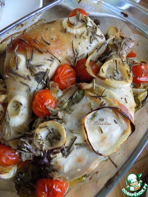 На овощную подушку выкладываем листочки базилика, на него - ножки, аккуратно кладём помидорки сверху, лук и чеснок из-под маринада. Кольца лука я разложила поверх ножек. Розмарин у меня был высушенными веточками. Я посыпала им ножки примерно 1 ч л. Поливаем маринадом всё и сбрызгиваем второй ложкой оливкового масла.