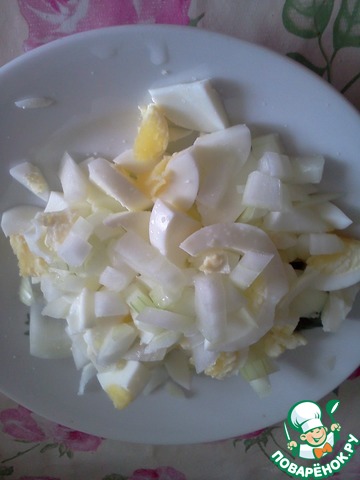Вареные яйца и лук чистим, шинкуем.