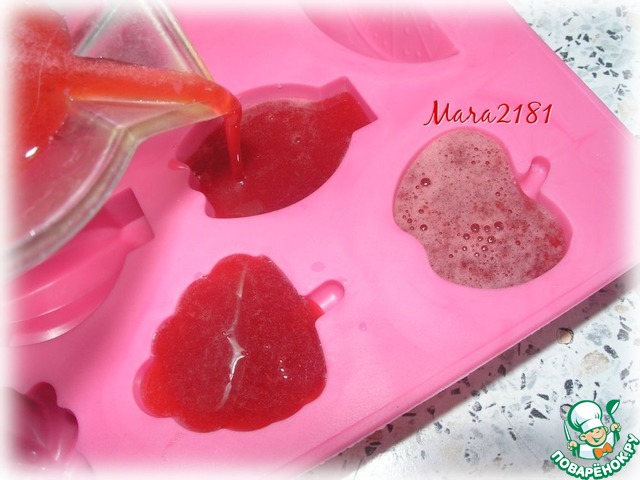 Получилось 25 мл свежего вишнёвого сока, к которому добавить 75 мл воды и 1 ч. л. сахара. Хорошо перемешать для растворения сахара, разлить в формочки для льда и убрать в морозильную камеру до застывания.