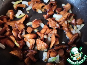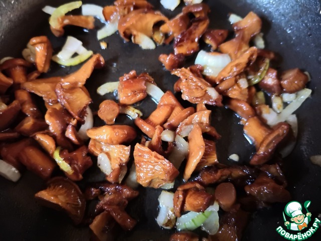 В это же время обжарить мелкопорезанный лук и грибы до готовности.