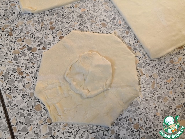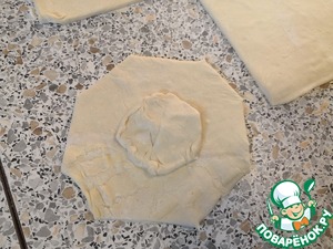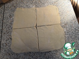 Тесто раскатать и разрезать на 4 квадрата.