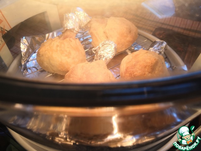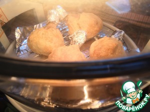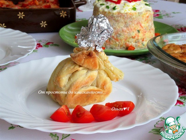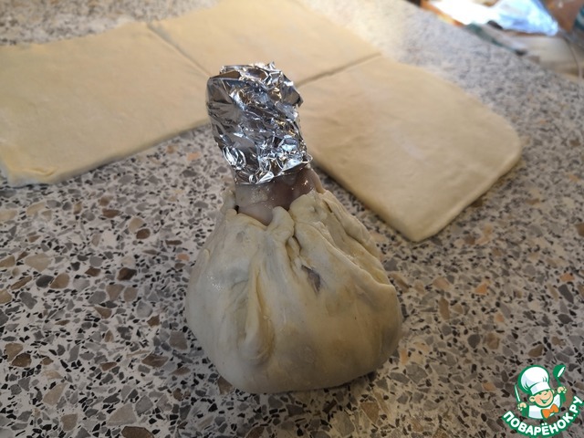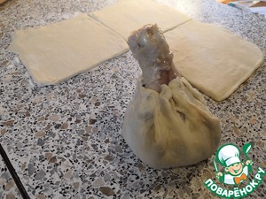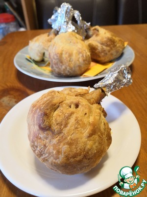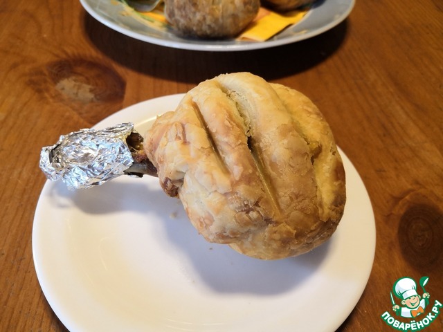 Голени цыпленка, запечённые в мешочках из слоёного теста с начинкой из картошки (с грибами - по желанию) в аэрогриле.