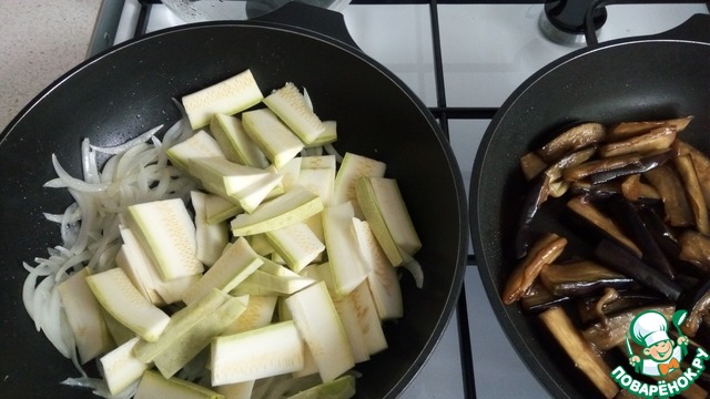 К луку добавляем кабачки, все овощи обжариваются слегка