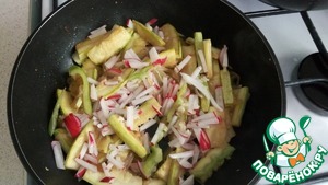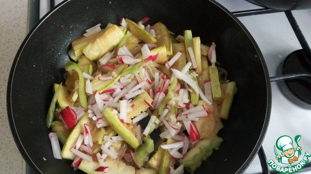 На сковороду к луку, кабачку и редису добавляем перец на 1-2 минуты