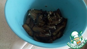 Готовые баклажаны перекладываем в чашу к мясу и пока они горячие добавляем к ним чеснок