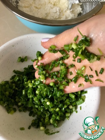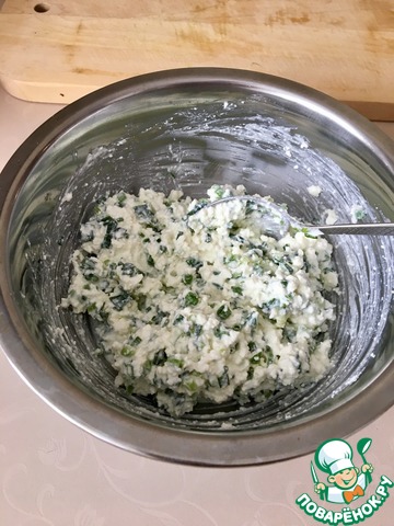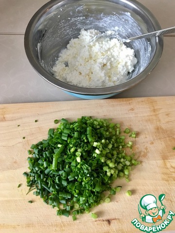 Соединяем лук с творогом. Начинка готова.
