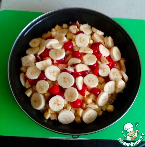 Приготовила) Очень вкусно, просто и быстро Но, на мой вкус, бананы там лишние, лучше яблоки и вишня , но это на мой вкус) Форма у меня разъемная 16 или 18см,ничего не развалилась, режется кусочками, все отлично, спасибо за рецепт а, и брала маргарин вместо масла