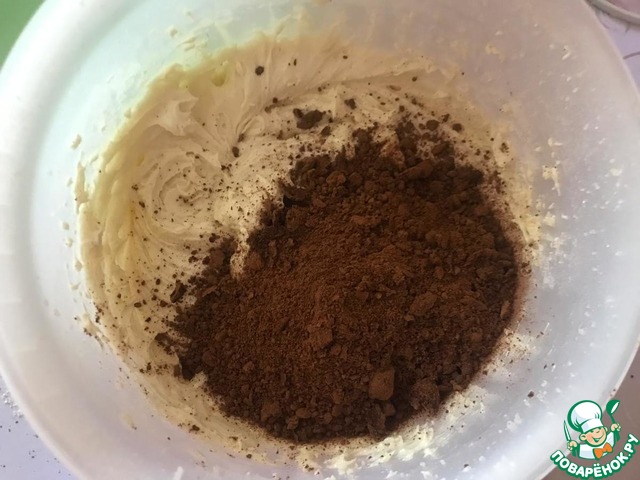 Затем, в горячую воду добавляем 4ст. л какао, перешиваем и добавляем его в массу.