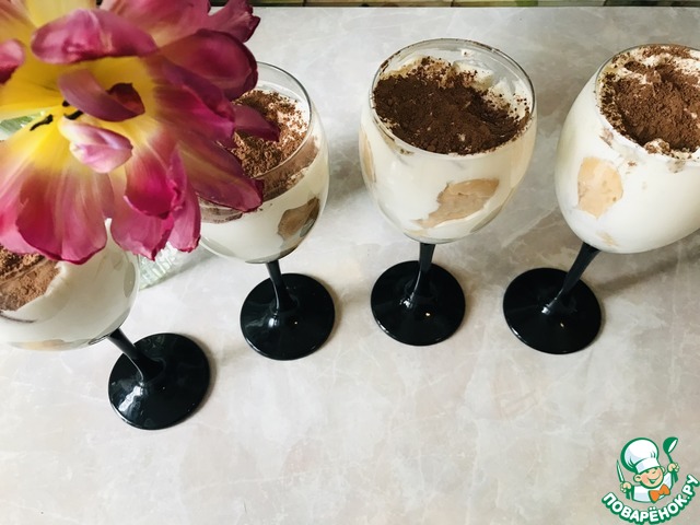 3. Приступаем к сборке: для этого печенье Савоярди быстро окунаем в кофейную пропитку и укладываем в стакан, плотно друг к другу, сверху заливаем крем. Продолжаем чередовать слои до верха стакана. Накрываем десерт пищевой пленкой и убираем на 5-8 часов в холодильник.