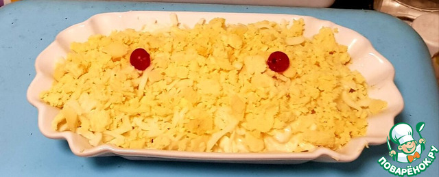 Все еще раз повторить и сверху посыпать измельченными желтками.