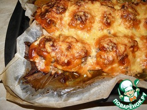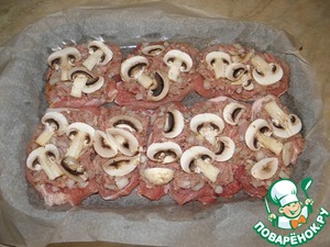 Шампиньоны нарезаем пластинками, раскладываем сверху на фарш, немного вдавливая их в него