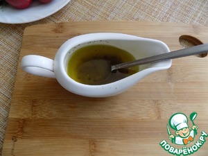 Солим и перчим по вкусу ингредиенты для заправки и тщательно соединяем.