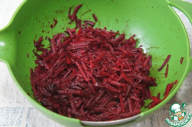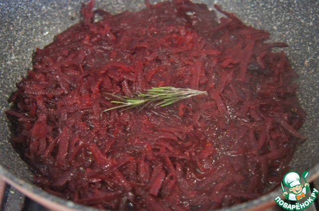 В глубоком сотейнике разогреть масло и, помешивая, обжарить свеклу вместе с веточкой розмарина 5 минут. Затем влить половник бульона и тушить свеклу под крышкой на маленьком огне 15 минут. В конце розмарин удалить.