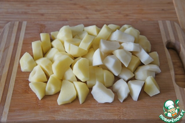 Тем временем нашинковать морковь соломкой и слегка спассеровать на масле. Пока тушится морковь, нарезать картофель небольшими кусочками.