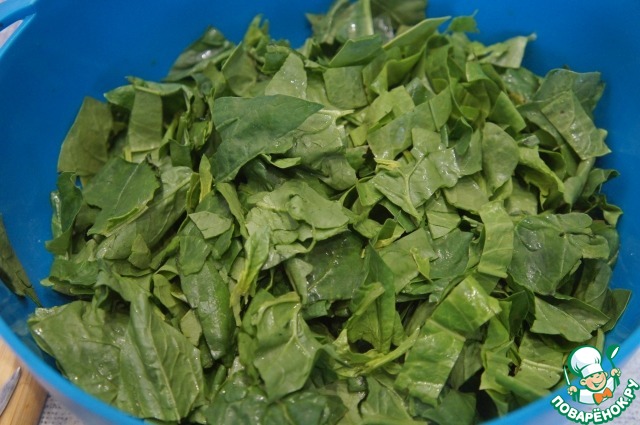 Шпинат и щавель тщательно промыть, стряхнуть воду и разложить на полотенце, чтобы они немного обсохли.