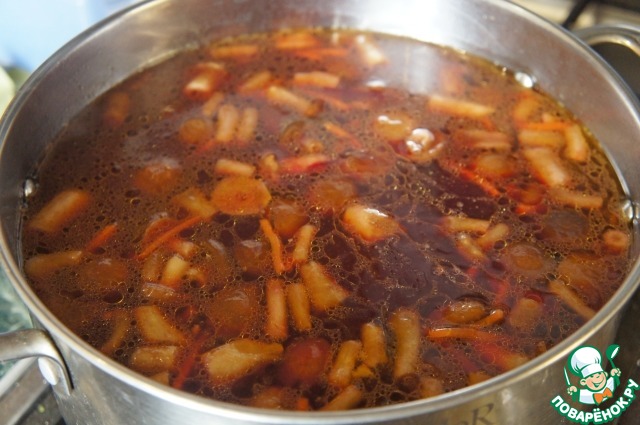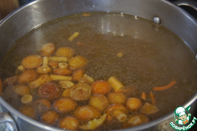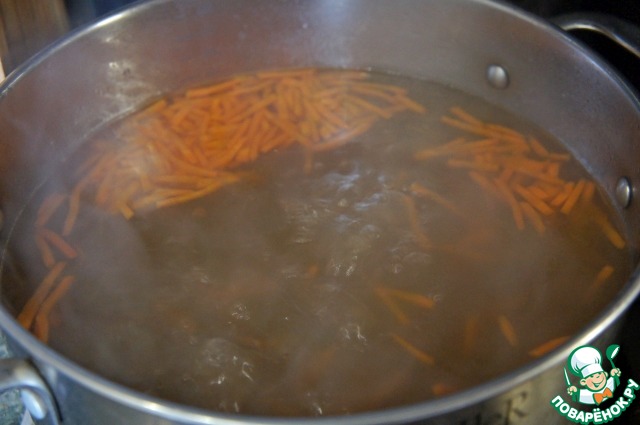 В кипящий бульон запустить картофель и морковь, довести до кипения.