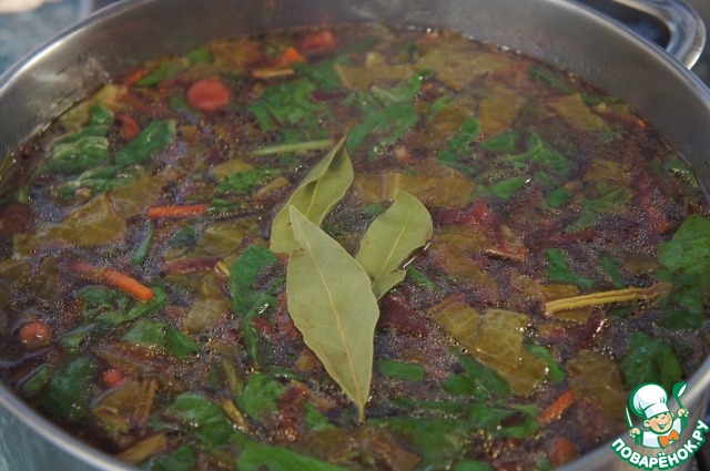 Добавить лавровый лист и прогреть суп 3 минуты.