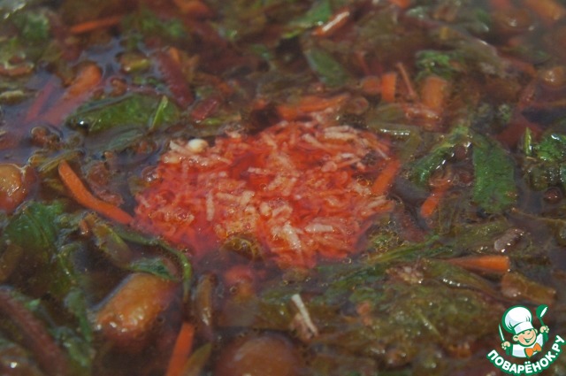 Снять с огня, добавить измельченный чеснок и накрыть кастрюлю крышкой. Настаивать 10-15 минут.
