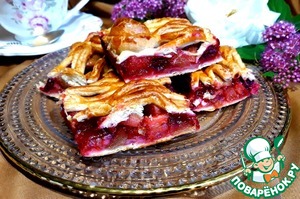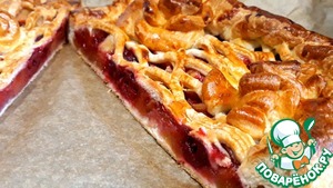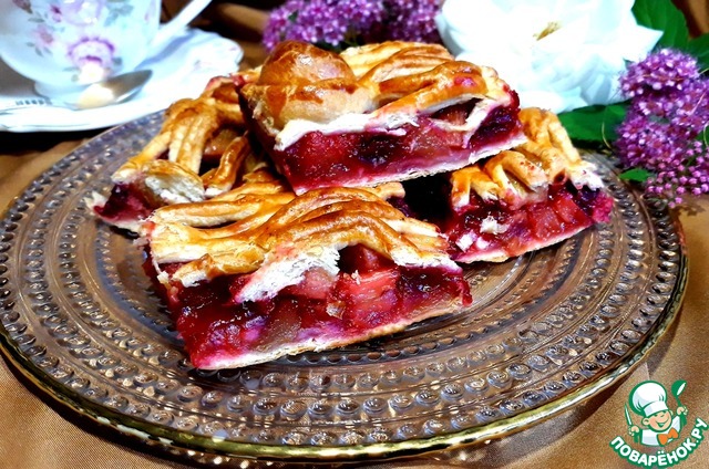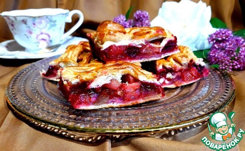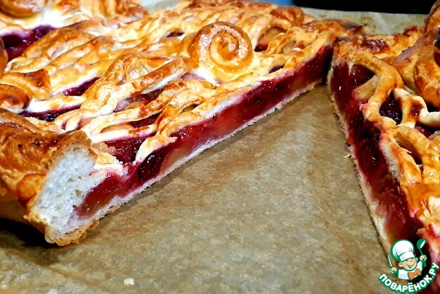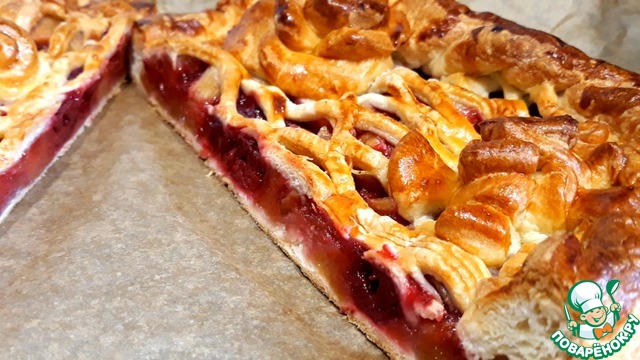 Пирог из готового слоёного дрожжевого теста готовится быстро. Есть его можно сразу, т. к начинка не вытекает во время разрезания. Мне очень нравятся пироги с кисло-сладкой начинкой.