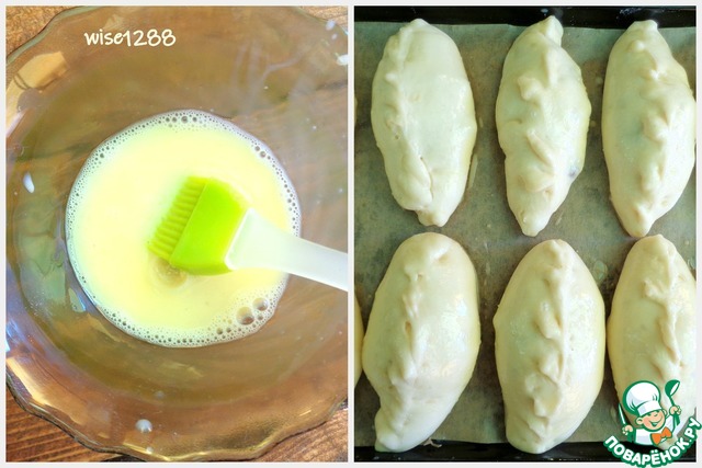 Пирожки переложить на противень, застеленный бумагой для выпечки. Поставить на расстойку на 20 – 30 минут в теплое место. Включить духовку разогреваться до температуры 180 градусов. Яйцо взбить. Смазать подошедшие пирожки яйцом.