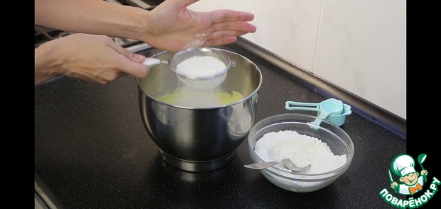• К муке добавляю разрыхлитель и ванильный сахар, все хорошо перемешиваю. И просеиваю в 2-3 захода в яично-маслянную смесь. Каждый раз хорошо перемешиваю. Делаю это не долго, чтобы яйца не потеряли свою пышность, но при этом не должно остаться невымешанных комочком муки.