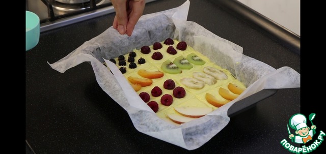 Если хотите, чтобы фрукты на тонули в тесте, берите форму больше, чтобы слой теста был тоньше.