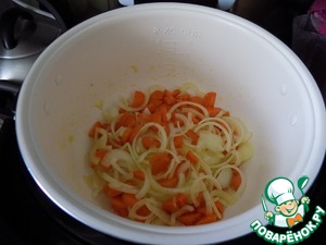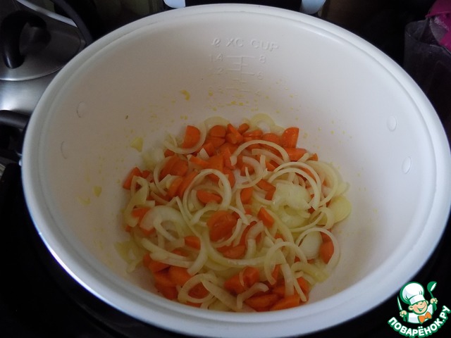 В кастрюлю мультиварки наливаем масло оливковое, включаем режим обжарки. Выкладываем лук репчатый, порезанный полу-кольцами. Масло оливковое можно заменить подсолнечным. Лук золотим.