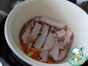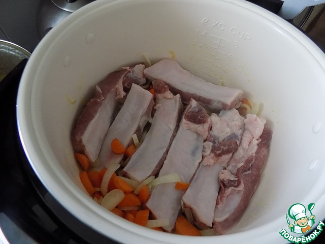 Через три минутки отправляем в кастрюлю рёбра. Немного всё обжариваем. Совсем чуть-чуть.