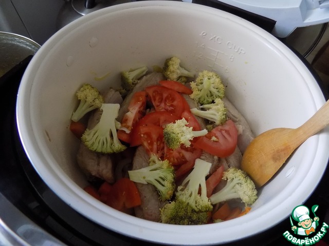 Добавляем овощи: помидор, порезанный произвольно, корень и черешки петрушки, порезанные очень мелко и соцветия брокколи. С помидора можно снять кожицу, я этого не сделала. Помидор даст сок. Тушим всё минут 5.