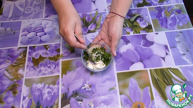 К майонезу добавляем измельченную зелень (у меня петрушка) и измельченный чеснок.
