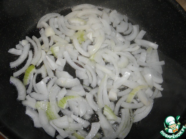 Лук нарезаем четверть кольцами и пассеруем в растительном масле (глубокая сковорода, сотейник)